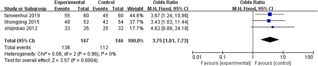 Three studies (Jinbao et al., 2012; Hongying et al., 2015; Wenhui and Shiliang, 2019) (n = 293) reported the efficacy of TCM symptoms after treatment, and the difference between the two groups was statistically significant [OR = 3.75, 95%CI (1.81, 7.73), Z = 3.57, P = 0.0004]. The Chinese patent medicine containing leech combined with conventional medicine in the treatment of CHD could improve the efficacy of TCM symptoms than conventional western medicine alone (Figure 6).