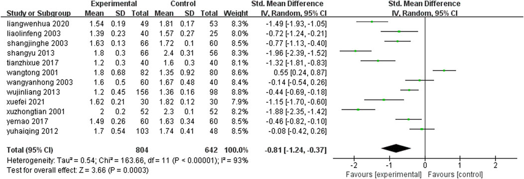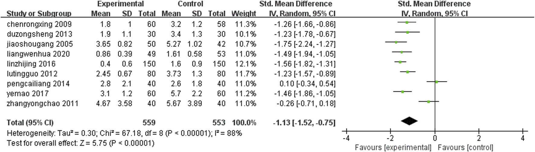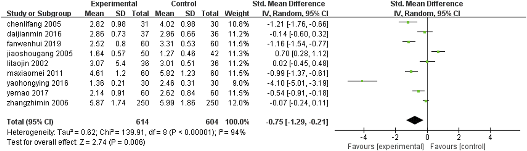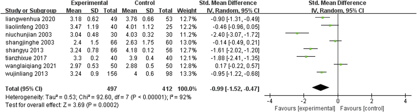 Eight studies (Chunjian et al., 2003; Jinghe, 2003; Linfeng, 2003; Jinliang and Yunyi, 2013; Yu, 2013; Zhixue et al., 2017; Wenhua et al., 2020; Laiqiang, 2021) (n = 909) reported fibrinogen levels in each group after treatment. Meta-analysis results showed that: The level of fibrinogen in the treatment group was lower than that in the control group [SMD = −0.99, 95%CI (−1.52, −0.47), Z = 3.69, P = 0.0002] (Figure 10).