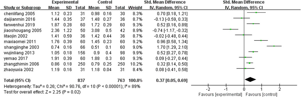 Eleven studies (Taojin, 2002; Yuxia et al., 2002; Jinghe, 2003; Lifang and Guofeng, 2005; Shougang, 2005; Zhi-Min et al., 2006; Xiao-Mei, 2011; Jinliang and Yunyi, 2013; Jianmin et al., 2016; Mao and Qiang, 2017; Wenhui and Shiliang, 2019) (n = 1,600) reported changes in HDL after treatment in each group. Meta-analysis results showed that: The level of high-density lipoprotein after leech combined with conventional medication was higher than that of conventional treatment alone, but there was no statistical significance [SMD = 0.37, 95%CI (0.05, 0.69), Z = 2.25, P = 0.02] (Figure 13).