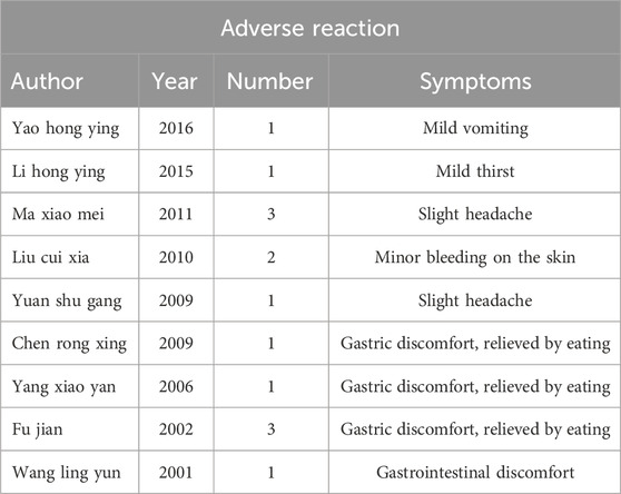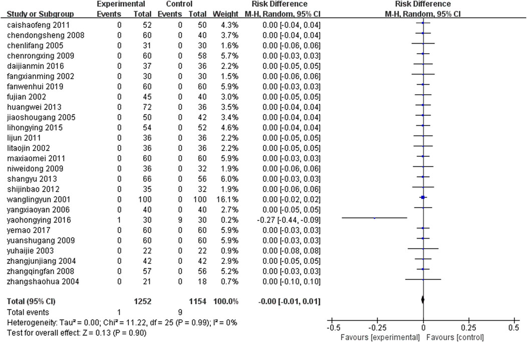 Twenty six studies (Wu et al., 2001; Jian and Xudong, 2002; Taojin, 2002; Xianming et al., 2002; Haijie and Changshi, 2003; Junjiang et al., 2004; Shaohua, 2004; Lifang and Guofeng, 2005; Shougang, 2005; Xiaoyan and Bainian, 2006; Dongsheng and Jimin, 2008; Qingfan and Hezhong, 2008; Rongxing and Linlin, 2009; Shugang et al., 2009; Weidong and Lihua, 2009; Jun et al., 2011; Shaofeng and Xinfeng, 2011; Xiao-Mei, 2011; Jinbao et al., 2012; Wei et al., 2013; Yu, 2013; Hongying et al., 2015; Hongying et al., 2016; Jianmin et al., 2016; Mao and Qiang, 2017; Wenhui and Shiliang, 2019) (n = 2,406) reported the adverse reactions that occurred in the patients of each group after treatment. The number of adverse reactions and their symptoms are presented in Table 3. All adverse reactions were mild and resolved spontaneously after treatment. All adverse reactions were effectively managed through regular monitoring and appropriate intervention. The study found that compared with the group that only received conventional treatment, the incidence of adverse events in the group that received combined treatment with herbal medicine from earthworms did not significantly increase. The results of the meta-analysis showed that there was no statistically significant difference in the incidence of adverse reactions between the two groups [RD = 0.00, 95%CI (−0.01, 0.01), P = 0.90] (Figure 15).