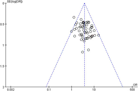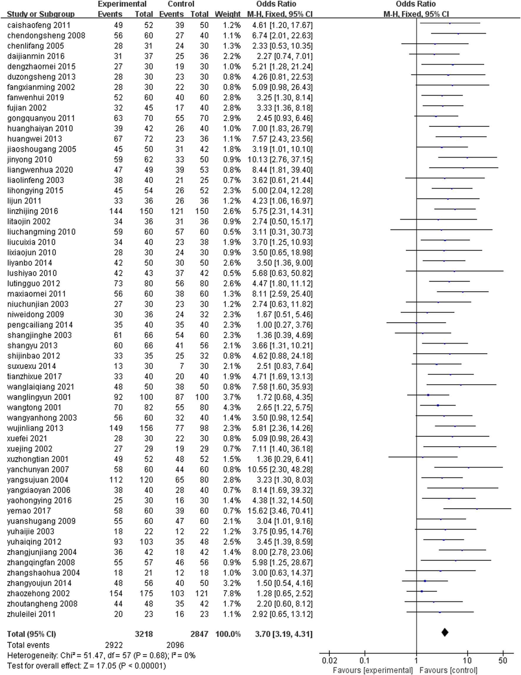 A total of 58 studies (Wu et al., 2001; Tong et al., 2001; Zhongtian and Rihui, 2001; Jian and Xudong, 2002; Jing et al., 2002; Taojin, 2002; Xianming et al., 2002; Zehong et al., 2002; Chunjian et al., 2003; Haijie and Changshi, 2003; Jinghe, 2003; Linfeng, 2003; Yanhong et al., 2003; Junjiang et al., 2004; Shaohua, 2004; Sujuan and Haijun, 2004; Lifang and Guofeng, 2005; Shougang, 2005; Xiaoyan and Bainian, 2006; Chunyan, 2007; Dongsheng and Jimin, 2008; Qingfan and Hezhong, 2008; Tangheng, 2008; Shugang et al., 2009; Weidong and Lihua, 2009; Changming, 2010; Cuixia and Cunji, 2010; Haiyan, 2010; Shiyao, 2010; Xiaojun, 2010; Yong, 2010; Jun et al., 2011; Leilei, 2011; Quanyou, 2011; Shaofeng and Xinfeng, 2011; Xiao-Mei, 2011; Haiqing, 2012; Jinbao et al., 2012; Tingguo et al., 2012; Jinliang and Yunyi, 2013; Wei et al., 2013; Yu, 2013; Zongsheng, 2013; Cailiang et al., 2014; Yanbo, 2014; Youjun, 2014; Xuexu et al., 2014; Hongying et al., 2015; Zhaomei and Lian, 2015; Zhijing et al., 2016; Hongying et al., 2016; Jianmin et al., 2016; Mao and Qiang, 2017; Zhixue et al., 2017; Wenhui and Shiliang, 2019; Wenhua et al., 2020; Fei, 2021; Laiqiang, 2021) with total clinical response rate as the outcome index, a total of 6,065 patients were included. The total response rate of 58 studies was homogeneous (P = 0.68, I2 = 0%), and a fixed effect model was set. Meta-analysis results showed that: The total effective rate of the treatment group was higher than that of the control group, and the difference was statistically significant [OR = 3.70, 95%CI (3.19, 4.31), Z = 17.05, P < 0.00001], indicating that in terms of improving the total effective rate of coronary heart disease, the combination of conventional western medicine with leech Chinese patent medicine was significantly better than the simple conventional western medicine (Figure 4).