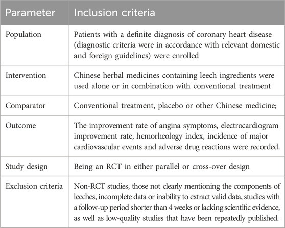 The studies were screened according to the PICOS framework. Eligible studies included RCTs evaluating the efficacy of Chinese herbal medicines containing leech components in CHD patients. Studies were excluded if they did not clearly mention the use of leech components, had incomplete data, or lacked scientific rigor (Table 1).