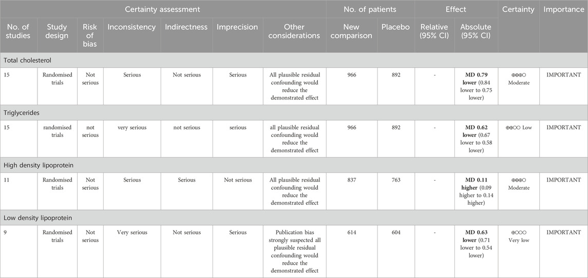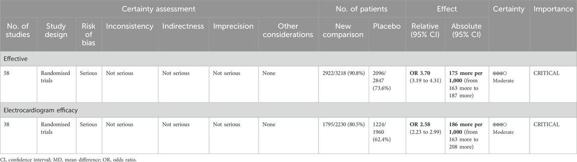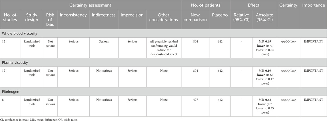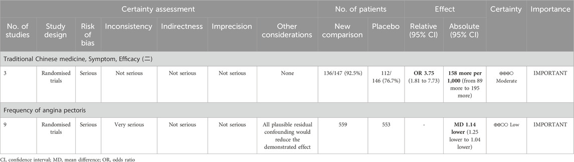 Using the GRADE approach, we conducted a certainty assessment for the primary outcome measures. For effective and ECG efficacy, the evidence was downgraded by one level due to serious concerns about risk of bias, resulting in moderate certainty of evidence (Table 4). For traditional Chinese medicine symptom efficacy, the evidence was rated as moderate certainty due to a high risk of bias. For the frequency of angina pectoris, the evidence was downgraded by two levels due to both a high risk of bias and publication bias, leading to low-certainty evidence (Table 5). For whole blood viscosity, plasma viscosity, and fibrinogen, some studies had limitations in clinical applicability, high uncertainty in results, and uncontrolled confounding factors, resulting in low-certainty evidence (Table 6). Regarding the biochemical indicator total cholesterol, although there were significant inconsistencies and precision issues, the risk of bias was low, and the evidence was rated as moderate certainty. For triglycerides, considering the substantial inconsistencies, precision issues, and the potential impact of residual confounding factors, the evidence was downgraded by two levels, ultimately rated as low certainty. For high-density lipoprotein (HDL), despite some inconsistencies and precision issues, the risk of bias was low, and the evidence was rated as moderate certainty. For low-density lipoprotein (LDL), due to severe inconsistencies, precision issues, and substantial publication bias, the evidence was downgraded by two levels, resulting in very low-certainty evidence (Table 7).