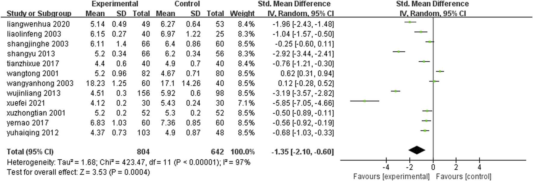Twelve studies (Tong et al., 2001; Zhongtian and Rihui, 2001; Jinghe, 2003; Linfeng, 2003; Yanhong et al., 2003; Haiqing, 2012; Jinliang and Yunyi, 2013; Yu, 2013; Mao and Qiang, 2017; Zhixue et al., 2017; Wenhua et al., 2020; Fei, 2021) (n = 1,446) reported on post-treatment whole blood viscosity levels in each group. Meta-analysis results showed that: The whole blood viscosity level was lower after the treatment of Chinese patent medicine containing leech ingredients combined with conventional medication than that of conventional treatment alone, and the difference between the two groups was statistically significant [SMD = −1.35, 95%CI (−2.10, −0.60), Z = 3.53, P = 0.0004] (Figure 8).