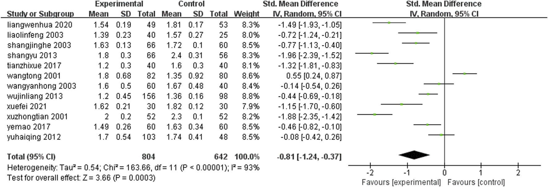 Blood urea nitrogen levels 12 studies (Tong et al., 2001; Zhongtian and Rihui, 2001; Jinghe, 2003; Linfeng, 2003; Yanhong et al., 2003; Haiqing, 2012; Jinliang and Yunyi, 2013; Yu, 2013; Mao and Qiang, 2017; Zhixue et al., 2017; Wenhua et al., 2020; Fei, 2021) (n = 1,446) reported changes in plasma viscosity after treatment in each group. Meta-analysis results showed that: The plasma viscosity level after treatment with leech Chinese proprietary medicine combined with conventional medication was lower than that of conventional treatment alone, and the difference was statistically significant [SMD = −0.81, 95%CI(-1.24, −0.37), Z = 3.66, P = 0.0003] (Figure 9).
