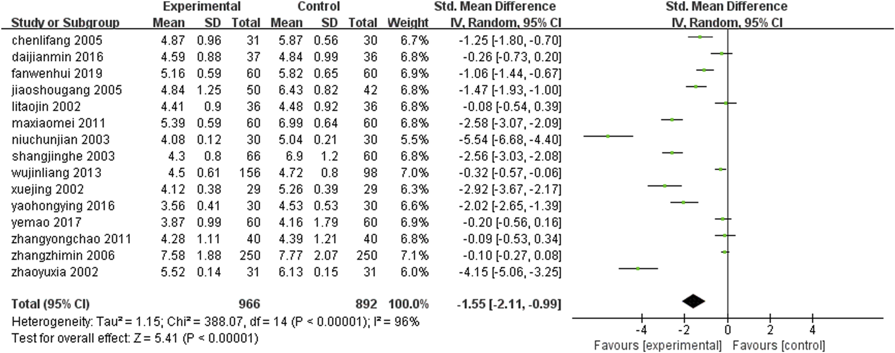 Fifteen studies (Jing et al., 2002; Taojin, 2002; Yuxia et al., 2002; Chunjian et al., 2003; Jinghe, 2003; Lifang and Guofeng, 2005; Shougang, 2005; Zhi-Min et al., 2006; Xiao-Mei, 2011; Yongchao et al., 2011; Jinliang and Yunyi, 2013; Hongying et al., 2016; Jianmin et al., 2016; Mao and Qiang, 2017; Wenhui and Shiliang, 2019) (n = 1858) reported the serum total cholesterol levels of each group after treatment. The results of Meta-analysis showed that the serum total cholesterol level after treatment with leech Chinese medicine combined with conventional treatment was lower than that of conventional treatment alone. The difference between the two groups was statistically significant [SMD = −1.55, 95%CI (−2.11, −0.99), Z = 5.41, P ≤ 0.00001] (Figure 11).