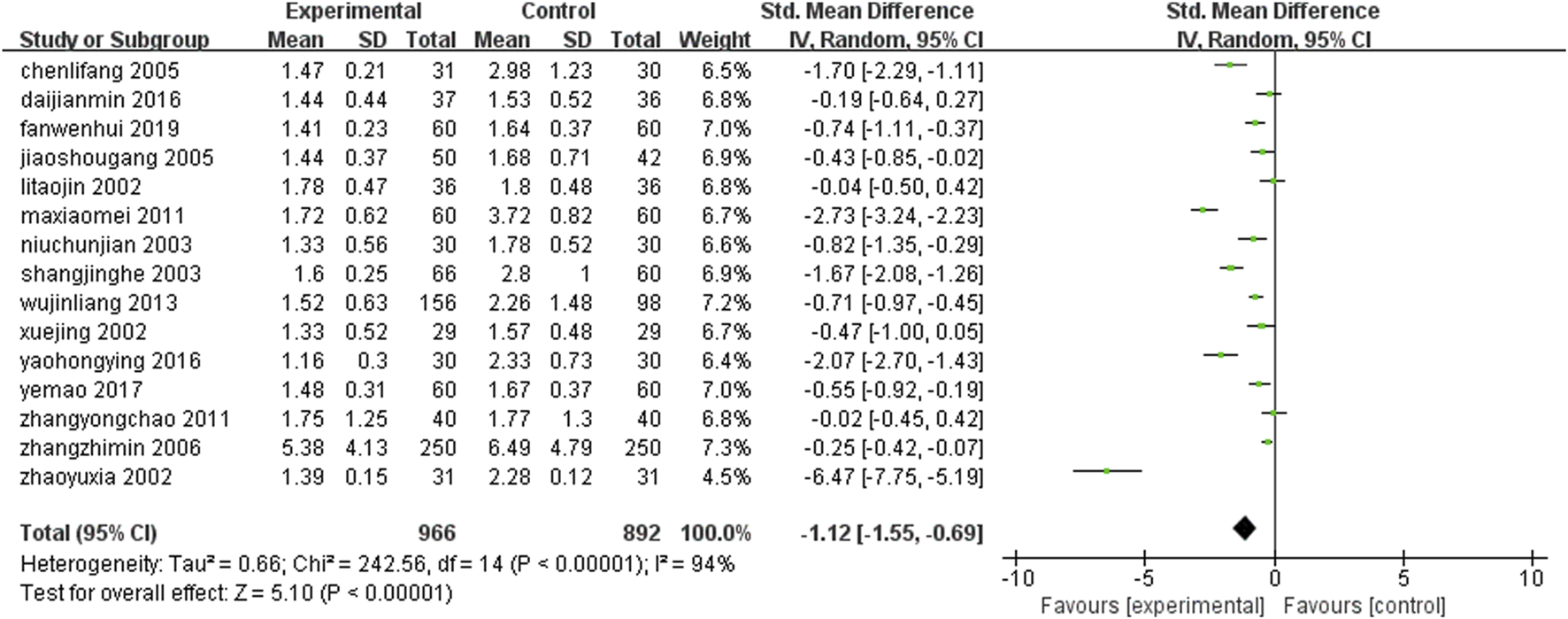 Fifteen studies (Jing et al., 2002; Taojin, 2002; Yuxia et al., 2002; Chunjian et al., 2003; Jinghe, 2003; Lifang and Guofeng, 2005; Shougang, 2005; Zhi-Min et al., 2006; Xiao-Mei, 2011; Yongchao et al., 2011; Jinliang and Yunyi, 2013; Hongying et al., 2016; Jianmin et al., 2016; Mao and Qiang, 2017; Wenhui and Shiliang, 2019) (n = 1858) reported the serum triglyceride levels of each group after treatment. The results of Meta-analysis showed that the serum triglyceride level of the treatment with leech Chinese medicine combined with conventional treatment was lower than that of conventional treatment alone. The difference between the two groups was statistically significant [SMD = −1.12, 95%CI (−1.55, −0.69), Z = 5.10, P ≤ 0.00001] (Figure 12).