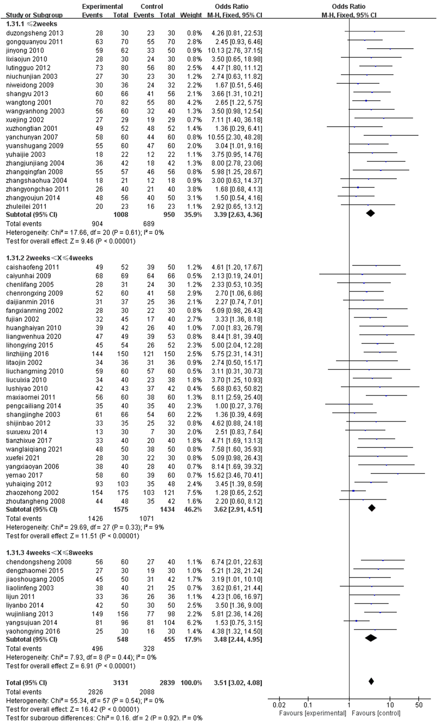 Subgroup analyses were performed on specific outcomes based on two primary intervention factors: drug type and treatment duration. The results consistently demonstrated that the experimental treatment outperformed the control group. The overall pooled odds ratio for all treatment combinations across subgroups classified by drug type was 3.76 (95% CI: 3.08–4.60), indicating a robust and consistent effect of the experimental treatment across all subgroups. Similarly, the overall effect across all treatment durations in the subgroups stratified by treatment duration was 3.51 (95% CI: 3.02–4.08), suggesting that treatment duration did not significantly impact the results, with the experimental treatment remaining effective across various timeframes. Statistical significance was observed in all subgroups. The forest plots of the results are presented in Figures 16, 17.