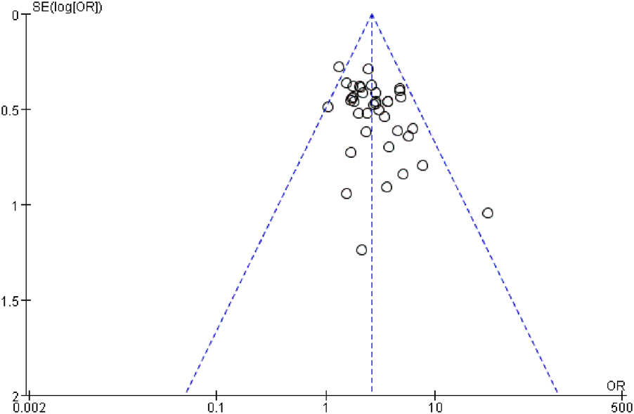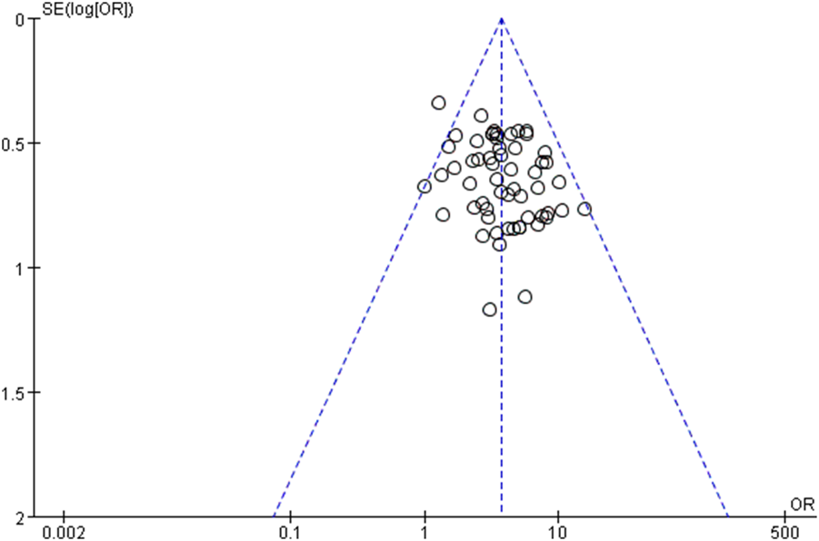 The risk of publication bias was evaluated using funnel plots for the total effective rate and ECG efficacy of the primary outcome indicators, as shown in Figures 18, 19, respectively. It was observed that the scatter points of the funnel plot of the two outcome indicators were distributed above the horizontal axis, but the distribution was basically symmetrical, suggesting that there was no risk of publication bias.