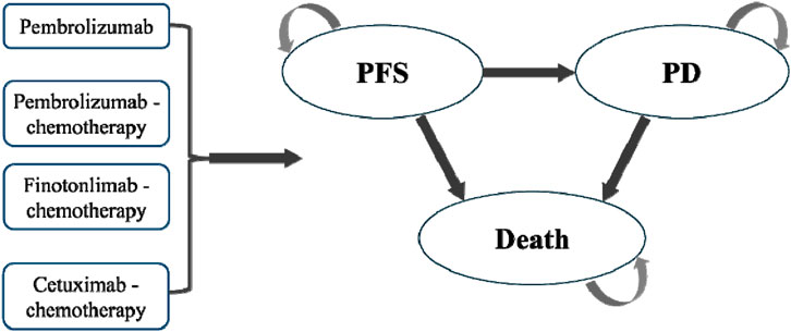 The model structure comprised three health states for R/M HNSCC: progression-free survival (PFS), progressive disease (PD), and death (Figure 1). All patients initially received first-line therapy (finotonlimab-chemo, pembrolizumab, pembrolizumab-chemo, or cetuximab-chemo) until disease progression or unacceptable toxicity (Figure 1). Upon progression, patients transitioned to second-line therapy (primarily taxane-based chemotherapy or best supportive care). In the base-case analysis, all patients were assumed to receive BSC for 3 months before death.