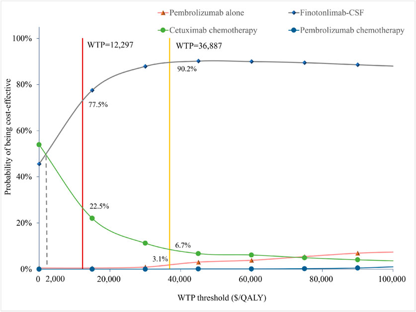 Figure 4 illustrated that, within the total population, the economic probability of cetuximab-chemo decreased rapidly while that of finotonlimab-chemo increased rapidly when the WTP threshold exceeded $2,000 per QALY. The finotonlimab-chemo group demonstrated a 77.5% and 90.2% probability of being cost-effective at WTP thresholds of $12,297 and $36,887/QALY, respectively. Within the population with PD-L1 CPS ≥1 and CPS ≥20, as the WTP threshold increased, the probability of cetuximab being cost-effective rapidly decreased, while both pembrolizumab monotherapy and combination therapy demonstrated significant improvement in cost-effectiveness. When the WTP threshold was set at $36,887 per QALY, pembrolizumab monotherapy demonstrated a 10.8% and 21.9% probability of being cost-effective within the population with PD-L1 CPS ≥1 and CPS ≥20, respectively (Supplementary Figure S11).