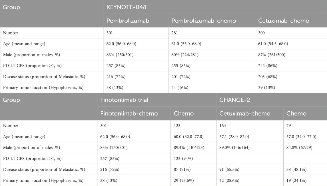 Since the 1990s, platinum-based chemotherapy has been the standard first-line treatment for recurrent/metastatic (R/M) HNSCC (Forastiere et al., 1992; Gibson et al., 2005). However, their effect on improving patient survival has remained limited. With the advancement of targeted therapies, the combination of cetuximab and platinum-based chemotherapy has demonstrated significant progress in R/M HNSCC, increasing the median overall survival (OS) to 10.1 months and decreasing the mortality risk by 20% compared to the chemotherapy-only group (Vermorken et al., 2008). In recent years, the success of the KEYNOTE-048 study has marked the beginning of the immunotherapy era for R/M HNSCC (Burtness et al., 2019). Pembrolizumab monotherapy respectively prolonged the OS to 14.9 months and 12.3 months in patients with programmed cell death one ligand-1(PD-L1) combined positive score (CPS) ≥ 20 and CPS ≥1, resulting in a 39% and 22% reduction in the risk of mortality compared with the cetuximab plus chemotherapy group. However, no significant advantage was observed for pembrolizumab monotherapy in the total population. In contrast, pembrolizumab plus chemotherapy, compared with cetuximab plus chemotherapy group, demonstrated a more pronounced benefit, reducing the risk of death by 38%, 36%, and 29% in patients with CPS ≥20, CPS ≥1, and the total population, respectively. Based on the positive findings, the combination of cetuximab and chemotherapy, pembrolizumab monotherapy (CPS ≥1), or combined with chemotherapy, have been recommended as first-line treatment regime in the 2025 Chinese Society of Clinical Oncology (CSCO) Guidelines. The latest randomized controlled trial (RCT) (Shi et al., 2024) demonstrated that the combination of finotonlimab with chemotherapy significantly prolonged OS compared to platinum-based chemotherapy alone (14.1 months vs. 10.5 months, hazard ratio [HR] = 0.73, 95% confidence interval [CI]: 0.57–0.95, P = 0.0165). This research positive outcome directly resulted in the approval by the National Medical Products Administration (NMPA) for the indication of finotonlimab in combination with platinum-based chemotherapy as a first-line treatment for R/M HNSCC in 2025. In the same year, this therapeutic regimen was officially incorporated into the CSCO guidelines. Notably, finotonlimab marks the first domestically developed PD-1 monoclonal antibody to receive approval for the treatment of R/M HNSCC in China.