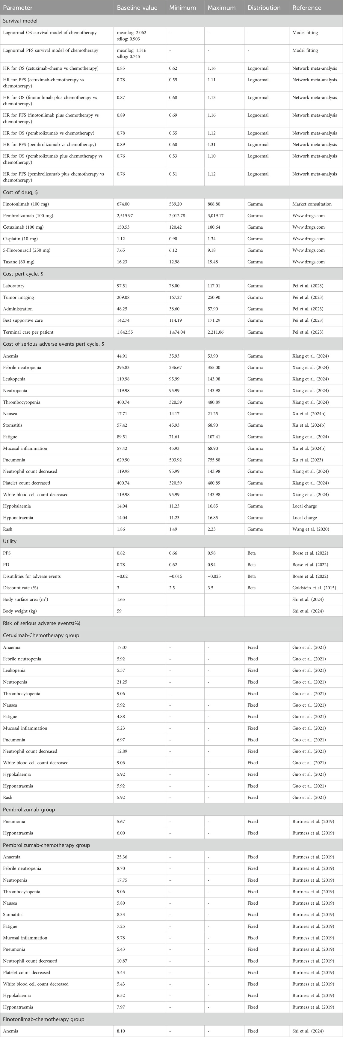 From the viewpoint of healthcare payers in China, the economic evaluation accounted for direct medical costs, such as costs for drug procurement, laboratory tests, tumor imaging, treatment administration, best supportive care, end-of-life care, and management of adverse events (see Table 2). The treatment regimen and dosing schedule were detailed in Supplementary Table S3. Drug costs were calculated based on body surface area (1.65 m2) and body weight (59 kg) (Shi et al., 2024), with unit prices sourced from gamma-distributed 2023 market data: finotonlimab, pembrolizumab, and cetuximab, conventional chemotherapy agents included cisplatin, 5-fluorouracil, and taxane (Table 2).