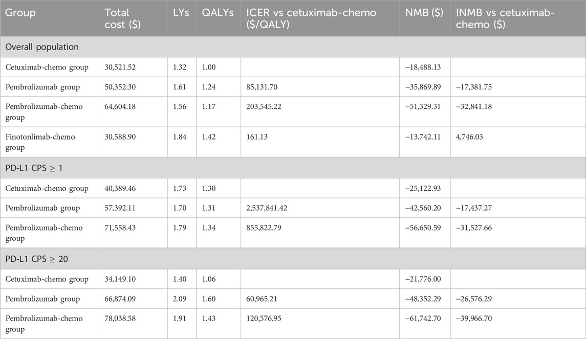 In the overall population, the finotonlimab-chemo group achieved the highest life years (LYs: 1.84) and quality-adjusted life years (QALYs: 1.42) at a lower total cost ($30,588.90), making it the most cost-effective option. In contrast, the cetuximab-chemo group had the lowest clinical benefits (LYs: 1.32, QALYs: 1.00) despite a similar cost ($30,521.52). Compared to cetuximab-chemo, pembrolizumab monotherapy (ICER: 85,131.70/QALY) and pembrolizumab-chemo (ICER: 203,545.22/QALY) were less cost-effective, while finotonlimab-chemo (ICER: 161.13/QALY) was significantly more favorable. The NMB analysis supported this finding, with finotonlimab-chemo group having the highest INMB ($4,746.03) compared to cetuximab-chemo, followed by pembrolizumab ($-17,381.75) and pembrolizumab-chemo ($-32,841.18).