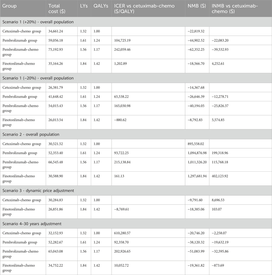 To evaluate the robustness of our cost-effectiveness findings, we conducted four scenario analyses: (1) We assessed the impact of drug price fluctuations by modeling ±20% variations in the costs of finotonlimab, pembrolizumab, and cetuximab, reflecting potential market changes or reimbursement adjustments. (2) We extended the treatment duration for pembrolizumab by 3 months to account for real-world clinical scenarios where patients may continue therapy beyond standard protocols due to delayed progression assessments or perceived clinical benefit, which was adopted by similar studies (Zhao et al., 2022; Su et al., 2021). (3) We simulated the impact of anticipated future price reductions for key drugs based on foreseeable market events within the Chinese healthcare landscape. For finotonlimab, we assumed its entry into the National Reimbursement Drug List (NRDL) in 2025, corresponding to year two of our model, followed by a price reduction of 60% thereafter-consistent with the typical discount achieved during China’s national medical insurance negotiations. For pembrolizumab, we projected a patent expiration and subsequent introduction of biosimilars into the Chinese market around 2028 (year four of the model), which would trigger a comparable 60% price reduction. Although biosimilars of cetuximab are already available, we applied a uniform 60% price reduction starting in 2028 to reflect potential intensified competition specific to the head and neck cancer indication and to ensure consistency across comparative treatment arms. (4) To evaluate the impact of the model’s time horizon on long-term outcomes, we also extended the simulation period to 30 years. These scenarios were selected to test the model’s sensitivity to critical economic and treatment duration parameters that could significantly influence the cost-effectiveness conclusions.