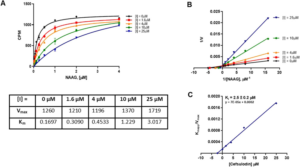 ![Graphical data illustrating enzyme kinetics with three plots. Panel A shows a saturation curve for NAAG concentrations against CPM at different inhibitor levels. Panel B presents a Lineweaver-Burk plot with inverse values of [NAAG] and 1/V at varied inhibitor concentrations. Panel C displays a secondary plot for Ki calculation against Cefsoludin concentration, showing a linear relationship. A table details Vmax and Km values at inhibitors ranging from 0 to 25 μM.](https://www.frontiersin.org/files/Articles/1646207/fphar-16-1646207-HTML/image_m/fphar-16-1646207-g003.jpg)