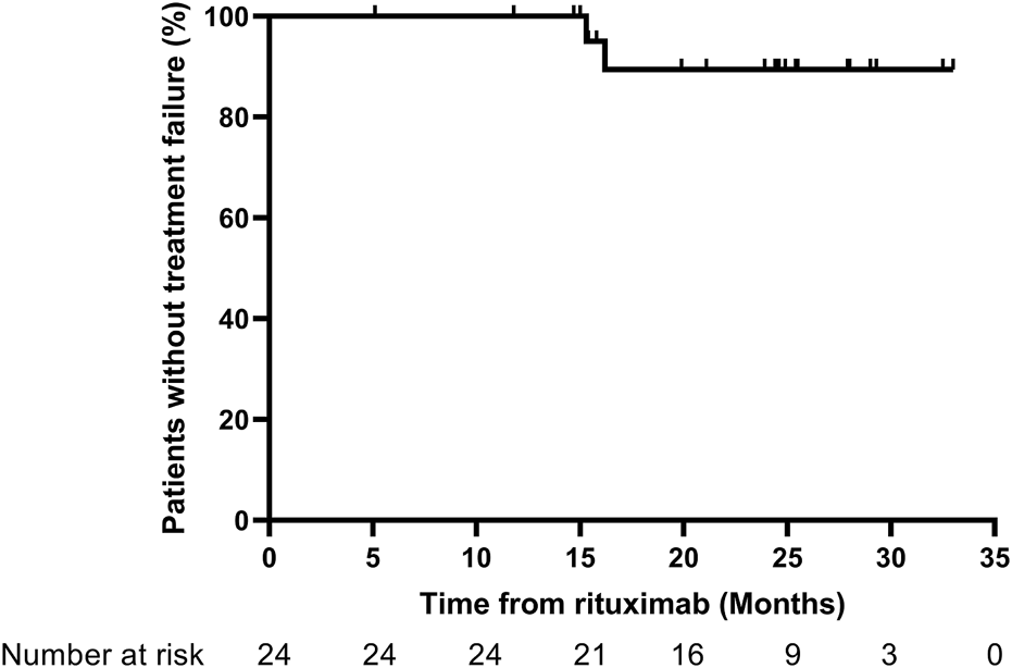 Through the 1-year follow-up, none of the patients experienced treatment failure. At the last follow-up, 2 patients had experienced treatment failure and developed frequent relapses at 15.3 and 16.2 months after RTX therapy. The corresponding treatment failure rate was 8.3% in this study. The Kaplan–Meier curves for treatment failure are shown in Figure 2.
