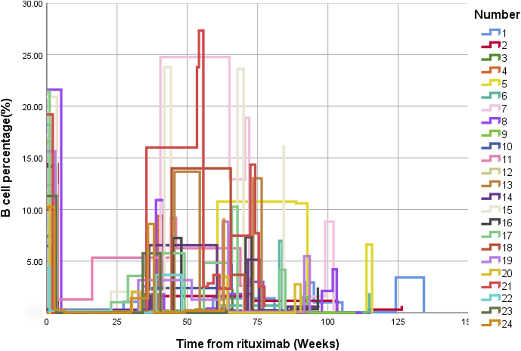 Changes in the percentage of CD19+ B cells before and after treatment with low-dose RTX. CD19+ B cell changes over time presented using multiple line graphs (interpolation: type [step], location [left]). Abbreviation: RTX, rituximab.