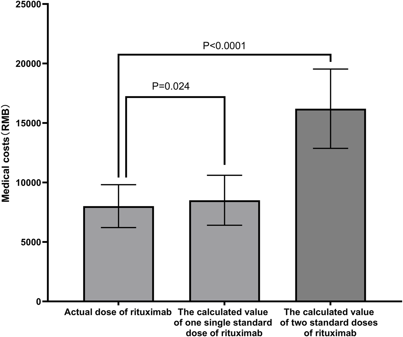 The medical costs for low-dose RTX followed by MMF were significantly lower than the calculated costs for one standard dose of RTX and two standard doses of RTX (Renminbi [RMB] 8,013 ± 1803 for low-dose RTX vs. RMB 8508 ± 2099 for one standard dose, P = 0.024, and RMB 16203 ± 3,380 for two standard doses, P < 0.001; Figure 5).