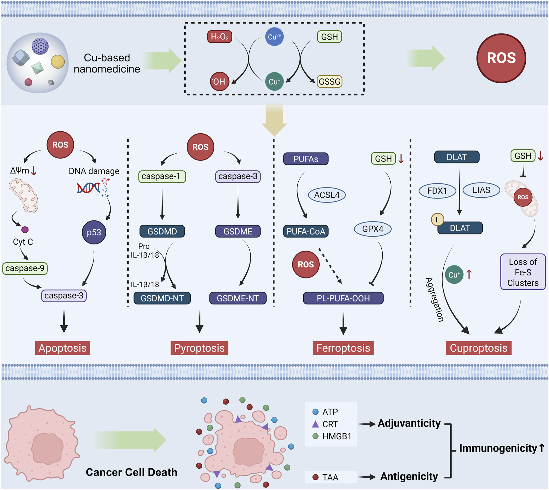 Figure 1. Mechanisms of copper-based nanomedicines in activating tumor immunity through oxidative Stress modulation. Copper-based nanomedicine enhances the immunogenicity of tumor cells by inducing multiple forms of RCD, including apoptosis, pyroptosis, ferroptosis, and cuproptosis. Subsequently, the dying cells release DAMPs to exert an adjuvant effect for immune activation, along with TAAs to elevate tumor antigenicity. These mechanisms act synergistically to collectively restore tumor immunogenicity.