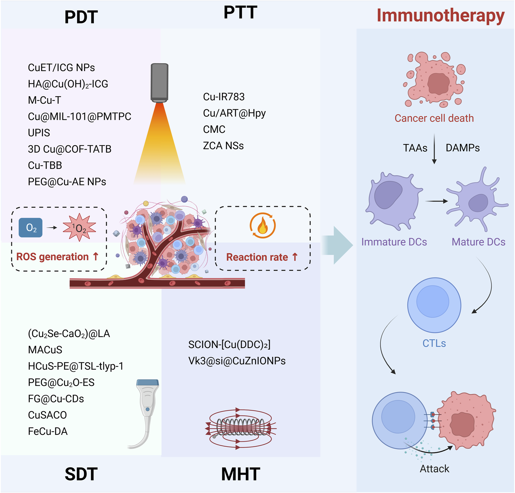 Figure 2. Multimodal immunotherapies of copper-based nanomedicine driven by external energy fields. Copper-based nanomedicine augments ROS generation through PDT and SDT, while simultaneously accelerating Fenton-like reaction rate via the heat produced by PTT and MHT. This ROS-amplified multimodal therapeutic strategy ultimately induces cancer cell death, releasing DAMPs and TAAs. These signals promote DC maturation and enhance CTL infiltration into tumor tissue, thereby enabling effective tumor cell clearance.