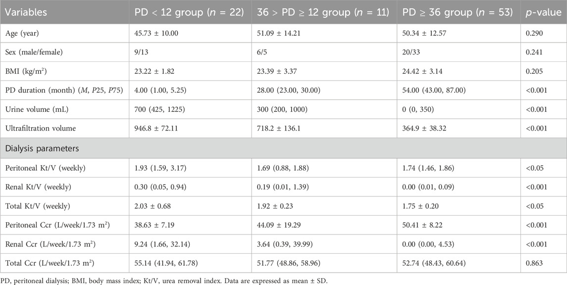 Patients who underwent regular PD were included in this study. PD effluent and fasting serum samples were collected from 86 patients for 4 h of peritoneal equilibration experiments, excluding those with recent or recurrent peritonitis. Patients were divided into three groups based on PD duration: long-term dialysis (n = 53, PD ≥ 36 months), initial dialysis (n = 22, PD < 12 months), and intermediate-term dialysis (n = 11, 36 > PD ≥ 12 months). SOCS1 and TGF-β1 expression in PD effluent was measured. Informed consent was obtained from all patients before collecting laparotomy effluent and serum samples. Clinical data collected included sex, age, dialysis duration, weekly Kt/V values, Ccr values, transit patterns, and ultrafiltration volumes. The study was approved by the Ethics Committee of the First Affiliated Hospital of Chengdu Medical College (approval number: 2022CYFYIRB-BA-APr01). The Watson formula was used to calculate peritoneal Kt/V in patients undergoing PD.