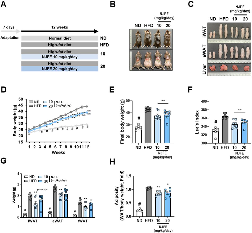 Figure 1. Effects of NJFE on lipid accumulation in high-fat diet (HFD)-induced obese mice. (A) The experimental plan for the in vivo studies. The treatment duration was 12 weeks. (B) Images of the mouse’s overall appearance and the intra-abdominal area. (C) Representative images of the inguinal (iWAT) and epididymal (eWAT) white adipose tissues and livers of mice. (D) The weekly body weight gains of the mice over the 12-week experimental period. (E) The final body weights of the mice. Mice fasted for at least 12 h prior to measurement, and their body weight was recorded immediately before sacrifice. (F) Lee’s index of the mice, calculated based on body weight and length. (G) The weight of mouse adipose tissues, measured from three areas: iWAT (subcutaneous fat), eWAT, and rWAT (visceral WAT). (H) The adiposity of the mice calculated based on mouse body weight and adipose tissue weight. All data are presented as means ± standard deviations. Statistical significance is denoted using symbols: “#” indicates a statistically significant difference (p < 0.05) between the control groups, ND and HFD, and “*” and “**” indicate p-values of <0.05 and <0.01 for comparisons between the NJFE-treated and HFD mice.