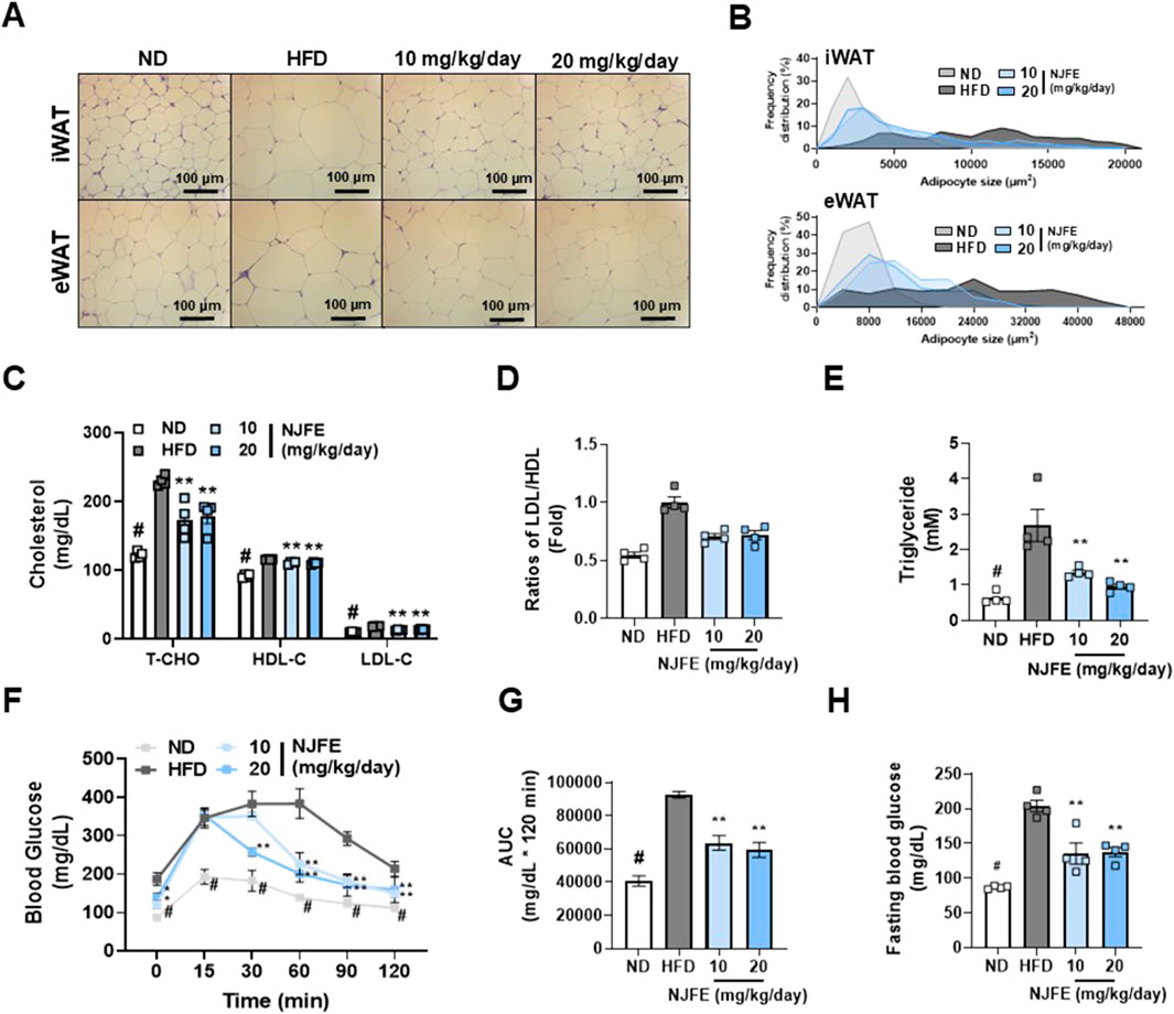 Figure 2. Effects of NJFE on adipocyte hypertrophy, dyslipidemia, and glucose intolerance in high-fat diet (HFD)-induced obese mice. (A) H&E staining images showing the morphology of lipid droplets in epididymal (eWAT) and inguinal (iWAT) white adipose tissues. Images were taken at 400× magnification. The scale bar represents 100 μm. (B) A graph showing the frequency distribution of lipid droplet areas (µm2) in iWAT (Top) and eWAT (Bottom), expressed as a percentage of the total quantified lipid droplet frequency distribution. (C) The serum cholesterol levels of the mice: T-CHO (total cholesterol), HDL-C (high-density lipoprotein cholesterol), and LDL-C (low-density lipoprotein cholesterol). (D) The LDL-C/LDL-C ratios of the mice. The LDL-C level was divided by the HDL-C level and expressed as a fold change relative to the mean LDL-C/LDL-C value of the control mice. (E) Serum triglyceride levels. (F) A GTT graph showing changes in the blood glucose levels of the mice. Glucose was injected at 0 min, and blood glucose levels were then measured at 30-min intervals through the tail vein. (G) An AUC (area under the curve) graph representing the quantified areas under the GTT curves in (F). (H) Fasting blood glucose levels of the mice. Blood was collected through the tail vein of mice after 12 h of fasting. All data are presented as means ± standard deviations. Statistical significance is denoted using symbols: “#” indicates a statistically significant difference (p < 0.05) between the control groups, ND and HFD, and “*” and “**” indicate p-values of <0.05 and <0.01 for comparisons between the NJFE-treated and HFD mice.