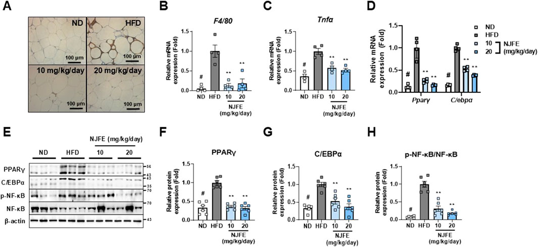 Figure 3. Effects of NJFE on adipose tissue inflammation in high-fat diet (HFD)-induced obese mice. (A) F4/80 immunohistochemistry images of epididymal white adipose tissue (eWAT). Images were taken at 400× magnification. The scale bar represents 100 μm. The mRNA levels of two genes in eWAT, measured using RT-qPCR: (B) F4/80 and (C) Tnfα. (D) Expression levels of two adipogenesis-related genes in eWAT at the mRNA level. (E) Protein expression levels of adipogenesis-related proteins, PPARγ and C/EBPα, and phosphorylated NF-κB in eWAT, measured via Western blot analysis. The numbers on the right indicate the molecular weights of the protein bands (kDa). (F) A graph of PPARγ protein expression quantified based on Western blot band intensities. (G) Graph of C/EBPα protein expression quantified based on Western blot band intensities. (H) Graph of NF-κB phosphorylation levels quantified based on Western blot band intensities. The phosphorylation level was calculated by dividing the p-NF-κB band intensity by the NF-κB band intensity. All Western blot band intensities and RT-qPCR results were normalized using β-actin and are presented as fold changes relative to the expression levels in the control (HFD) group. All data are presented as means ± standard deviations. Statistical significance is denoted using symbols: “#” indicates a statistically significant difference (p < 0.05) between the control groups, ND and HFD, and “**” indicates a p-value <0.01 for comparisons between the NJFE-treated and HFD mice.