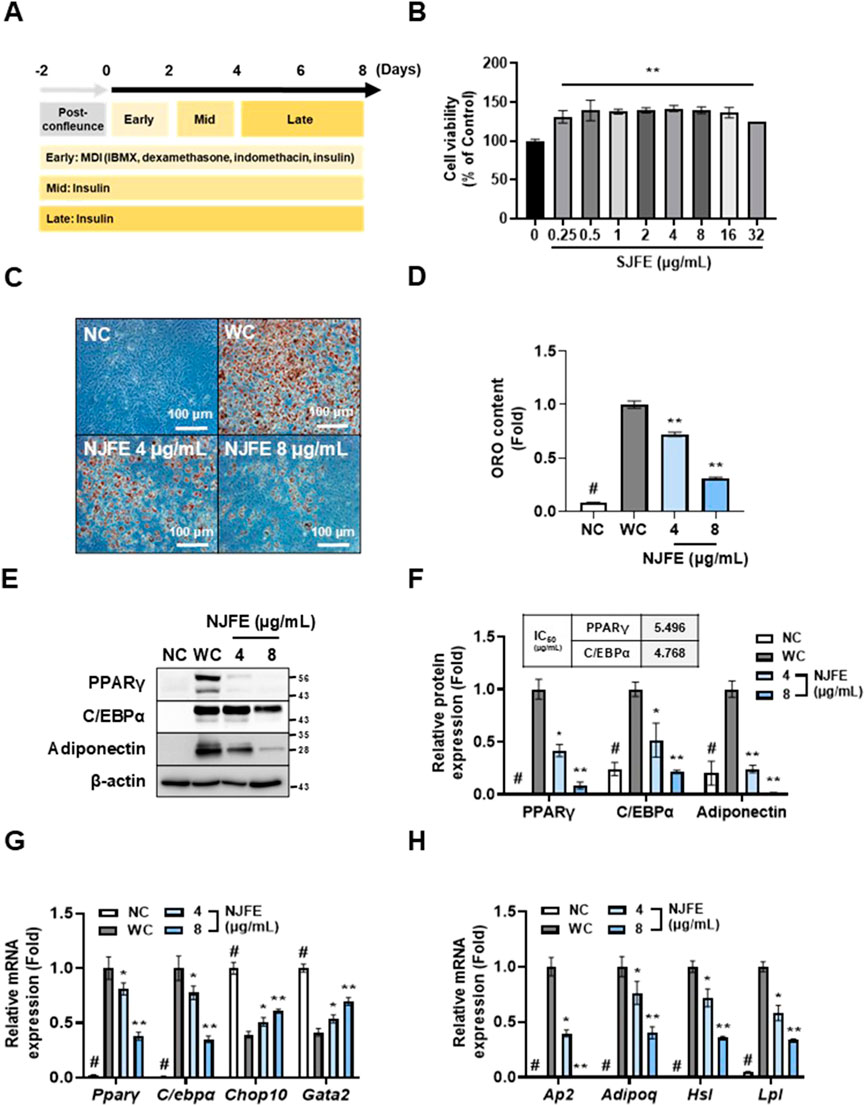 Figure 4. The inhibitory effect of NJFE on adipogenesis is mediated through the regulation of adipogenic differentiation-related gene expressions in 3T3-L1 adipocytes. In vitro experimental groups included NC (non-differentiated cells), WC (white adipocytes), and white adipocytes treated with NJFE at 4 or 8 μg/mL. (A) A schematic representation of the adipocyte differentiation protocol. Differentiation was induced by treating preadipocytes with MDI in the early stage, followed by insulin treatment during the mid and late stages. (B) The cell viability of 3T3-L1 cells after NJFE treatment, as assessed using the CCK-8 assay. For the control (0), the same volume of DMSO as that used in the 32 μg/mL NJFE group was applied. (C) Oil red O staining of differentiated adipocytes. Representative images of NC, WC, and NJFE-treated (4 and 8 μg/mL) cells are shown. Images were taken at 200× magnification. The scale bar represents 100 μm. Lipid accumulation is indicated by red staining. (D) A graph of oil red O (ORO) staining intensity, measured as absorbance at 450 nm. The bars represent relative lipid accumulation. (E) A Western blot membrane showing the protein expression levels of PPARγ, C/EBPα, and adiponectin. The numbers on the right indicate the molecular weights of the protein bands (kDa). (F) A graph of PPARγ, C/EBPα, and adiponectin protein expression levels quantified based on Western blot band intensities. The IC50 values (µg/mL) for PPARγ and C/EBPα are indicated at the top of the graph. Relative mRNA levels, based on RT-qPCR analysis, of (G) transcription factors related to adipocyte differentiation and (H) markers associated with adipocyte maturation and lipid accumulation. All Western blot band intensities and RT-qPCR results were normalized using β-actin and are presented as fold changes relative to the expression levels in the control (WC) group. All data are presented as means ± standard deviations. Statistical significance is denoted using symbols: “#” indicates a statistically significant difference (p < 0.05) between the control groups, NC and WC, and “*” and “**” indicate p-values of <0.05 and <0.01 for comparisons between the NJFE-treated adipocytes and WC.