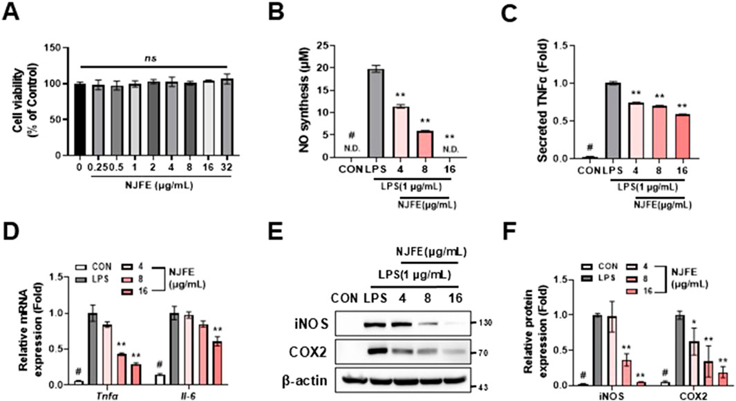 Figure 5. The anti-inflammatory effect of NJFE on macrophage-mediated inflammatory responses. (A) Cell viability of RAW264.7 cells after NJFE treatment, as assessed using the CCK-8 assay. For the control (0), the same volume of DMSO as that used in the 32 μg/mL NJFE group was applied. (B) The concentrations (μM) of nitric oxide (NO) secreted by RAW264.7 macrophages in the cell culture medium. (C) The concentrations of TNFα secreted by RAW264.7 macrophages in the cell culture medium. The values are presented as fold change relative to the control (LPS). (D) The relative mRNA levels of Tnfα and Il-6 in RAW264.7 macrophages, measured using RT-qPCR. (E) A Western blot membrane showing the protein expression levels of iNOS and COX2. The numbers on the right indicate the molecular weights of the protein bands (kDa). (F) A graph of iNOS and COX2 protein expression levels quantified based on Western blot band intensities. Western blot band intensities and RT-qPCR results were normalized using β-actin and are presented as fold changes relative to the expression levels in the control (LPS) group. All data are presented as means ± standard deviations. Statistical significance is denoted using symbols: “#” indicates a statistically significant difference (p < 0.05) between the control groups, CON and LPS, and “*” and “**” indicate p-values of <0.05 and <0.01 for comparisons between the NJFE-treated and LPS cells.