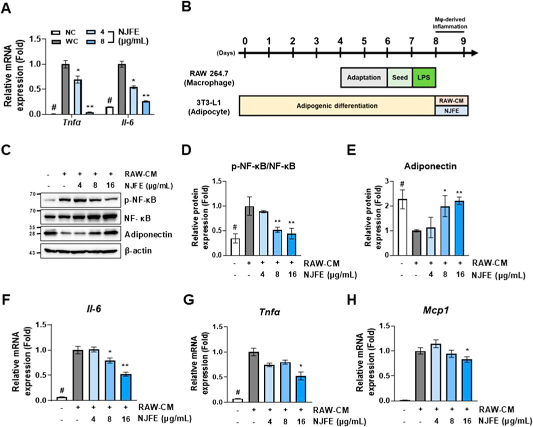 Figure 6. The alleviative effects of NJFE on adipocyte inflammation induced by lipogenesis and an activated macrophage-conditioned medium. (A) The relative mRNA levels of Tnfα and Il-6 in 3T3-L1 adipocytes. (B) A schematic detailing the treatment of 3T3-L1 cells with a RAW264.7 macrophage-conditioned medium (RAW-CM) in cell culture experiments. (C) A Western blot membrane showing the phosphorylation level of NF-κB and adiponectin protein expression. The numbers on the left indicate the molecular weights of the protein bands (kDa). (D and E) Graphs of (D) NF-κB phosphorylation levels and (E) adiponectin expression levels, both quantified based on Western blot band intensities. The relative mRNA levels, based on RT-qPCR analysis, of (F) Il-6, (G) Tnfα, and (H) Mcp1 in RAW-CM-treated 3T3-L1 adipocytes. Western blot band intensities and RT-qPCR results were normalized using β-actin and are presented as fold changes relative to line 2. All data are presented as means ± standard deviations. Statistical significance is denoted using symbols: “#” indicates a statistically significant difference (p < 0.05) between the control groups, lines 1 and 2, and “*” and “**” indicate p-values of <0.05 and <0.01 for compared to line 2.