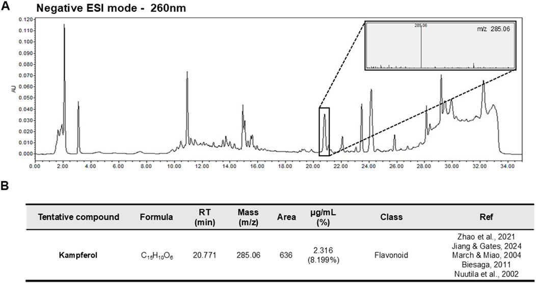The presence of kaempferol derivatives in Neoshirakia japonica (Siebold & Zucc.) Esser [Euphorbiaceae] has been previously reported in the literature (Zhao et al., 2021). Kaempferol was tentatively identified in NJFE based on mass spectral data obtained in this study by comparison with an LC-MS spectral library and previously reported metabolites isolated from Neoshirakia japonica (Siebold & Zucc.) Esser [Euphorbiaceae] (Jiang and Gates, 2024; March and Miao, 2004; Zhao et al., 2021) (Figures 7A,B). Parent ion analysis using LC-MS revealed a prominent signal corresponding to the free form of kaempferol ([M-H]-, m/z 285.06), which differs from the kaempferol derivatives commonly reported in the literature. It has been documented that kaempferol glycosides can be hydrolyzed into their aglycone forms under certain extraction conditions or due to specific sample characteristics, though it is also possible that the free form originally existed in the extract (Biesaga, 2011; Nuutila et al., 2002). The concentration of kaempferol in NJFE (10 ppm) was determined to be 2.316 μg/mL. Kaempferol has been reported to exhibit anti-obesity and anti-inflammatory activities, supporting the relevance of our findings (Alam et al., 2020; Bian et al., 2022). These findings suggest that kaempferol may be one of the bioactive metabolites contributing to the observed anti-obesity and anti-inflammatory effects of NJFE. The chemical fingerprint established here provides a foundational understanding of the bioactive metabolites contributing to the anti-obesity and anti-inflammatory effects demonstrated by NJFE.