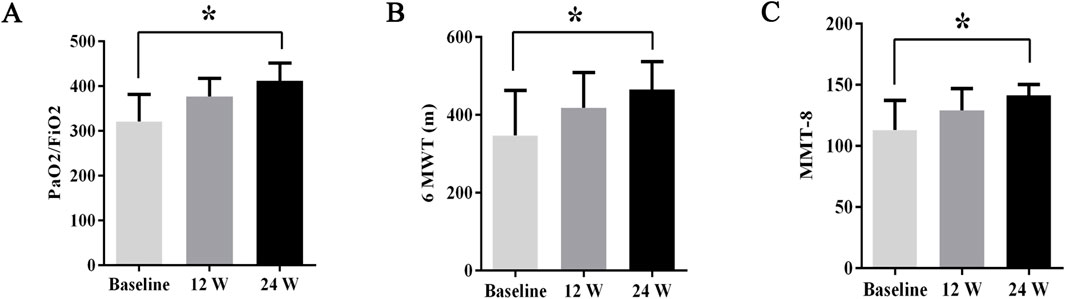 Figure 1. The changes in PaO2/FiO2 ratios, 6MWT outcomes, and MMT8 scores before and after treatment. Post-treatment results demonstrated significant improvements: (A) PaO2/FiO2 ratios increased by 28.2%, (B) 6MWT outcomes improved by 34%, and (C) MMT8 scores increased by 25.1%. All data are presented as means ± standard errors of the means, with *p <0.05 indicating statistical significance compared to pretreatment data.