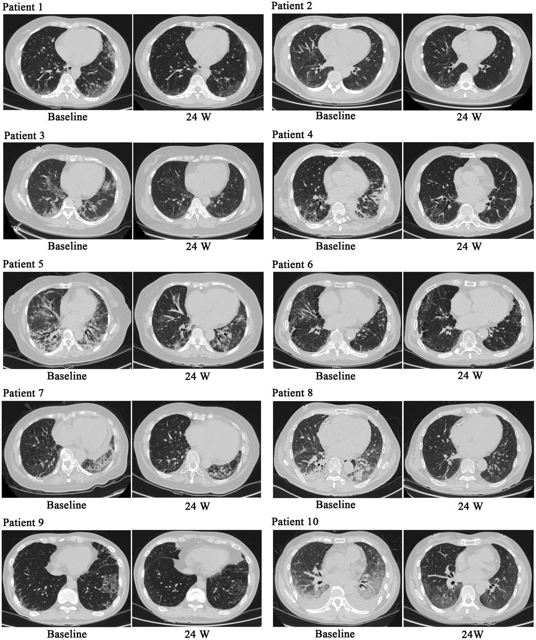 Figure 2. Chest HRCT before and after treatment. After treatment, chest HRCT scans demonstrated significant improvements compared with baseline.