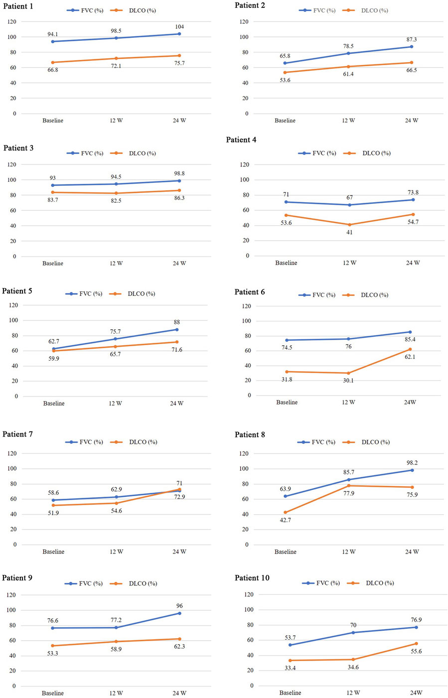 Among the 10 patients included in this study, four were male and six were female; their ages ranged from 45 to 75 years. Of them, seven patients had ASS-associated ILD, one had anti-MDA5 antibody-positive DM-associated ILD, and two had DM-associated ILD. Table 1 presents the baseline data of all patients.