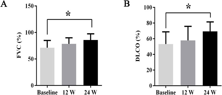 Figure 4. The changes in FVC% and DLCO% before and after treatment. Post-treatment, (A) FVC% increased by 20.4%, (B) DLCO% improved by 30.2%. All data are presented as means ± standard errors of the means, with *p < 0.05 indicating statistical significance compared to pretreatment data.