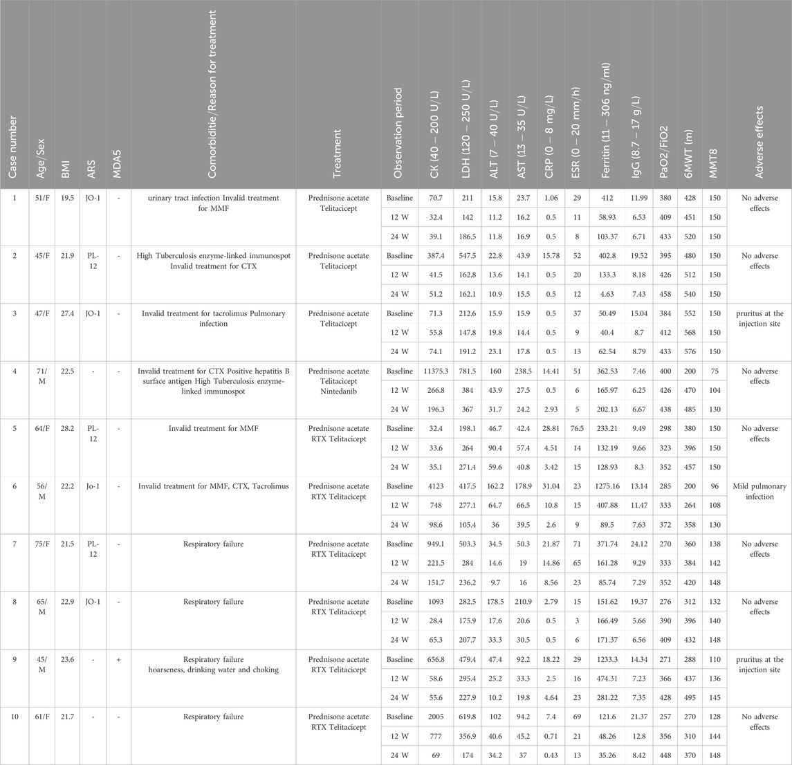 Methods: We included 10 patients with IIM-associated ILD; of them, seven had antisynthetase syndrome-associated ILD, one had anti-MDA5 antibody-positive dermatomyositis (DM)-associated ILD, and 2 had DM-associated ILD. Four patients with severe ILD were treated with a combination of rituximab (RTX) (375 mg/m2/week for 4 weeks) and telitacicept (160 mg/week). Six patients had refractory IIM-associated ILD; of them, two received RTX (375 mg/m2/week for 4 weeks) in combination with telitacicept (160 mg/week), and four were treated with telitacicept (160 mg/week) alone because they had an increased infection risk.