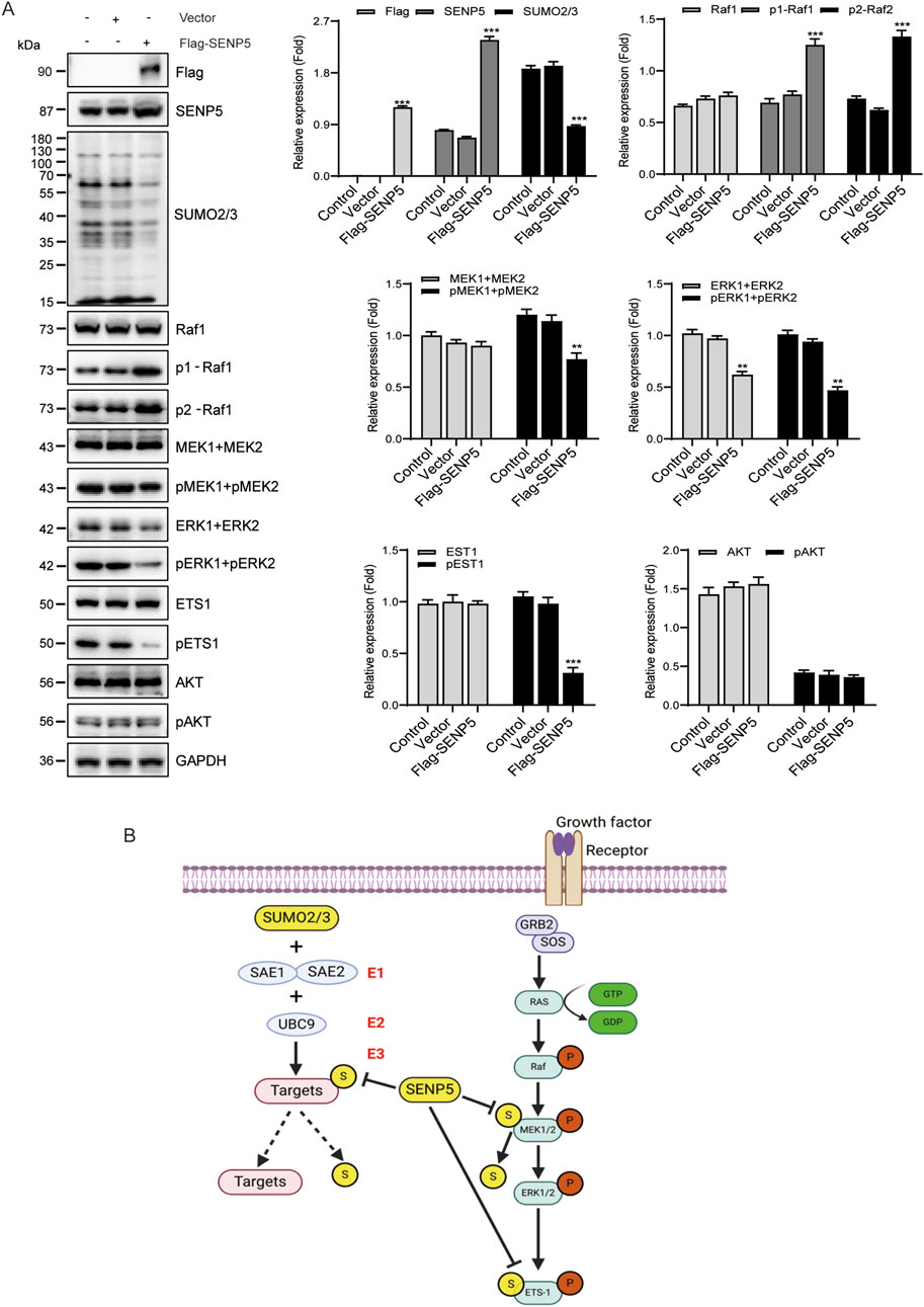 Figure 7. SENP5 Modulates the RAS/MAPK Pathway via SUMOylation and Phosphorylation Regulation. (A) Western blot analysis of key upstream and downstream molecules in the RAS/MAPK pathway following SENP5 overexpression. (B) Schematic diagram of the proposed molecular mechanism by which SENP5 regulates the RAS/MAPK pathway through SUMOylation and phosphorylation. Data are presented as mean ± SD (*p < 0.05, **p < 0.01, ***p < 0.001) where applicable.