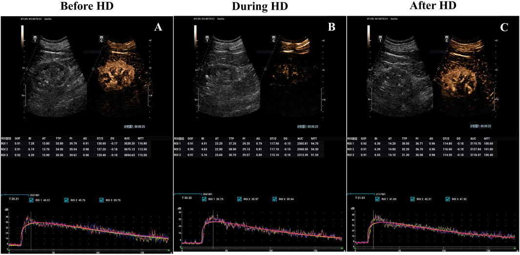 CEUS is an effective method for real-time, noninvasive, accurate, and quantitative assessment of renal perfusion (Kalantarinia et al., 2009; Kogan et al., 2011). Currently, it has shown promising utility in the investigation of various kidney diseases (Wang and Mohan, 2016), including chronic kidney disease (CKD) (Dong et al., 2014), Acute kidney injury (AKI) (Kalantarinia, 2009; Schneider et al., 2013), and kidney transplantation (Wang et al., 2015; Jin et al., 2015). Compared with contrast-enhanced computed tomography (CECT) and contrast-enhanced magnetic resonance (CEMR), CEUS offers advantages including lower cost, shorter performance time, absence of ionizing radiation and nephrotoxicity, and repeatability even at the bedside (Granata et al., 2021; Atri et al., 2022), thereby making it ideal for serial renal perfusion monitoring in HD patients. As a CEUS intensity parameter, PI demonstrates high sensitivity in detecting reductions in renal perfusion, accurately reflects alterations in renal cortical microcirculation, and shows a positive correlation with eGFR (Schneider et al., 2012; Xu et al., 2024). Therefore, similar to previous studies quantifying renal microperfusion, we used the PI as a surrogate measure of renal perfusion (Garessus et al., 2022; Damianaki et al., 2024).