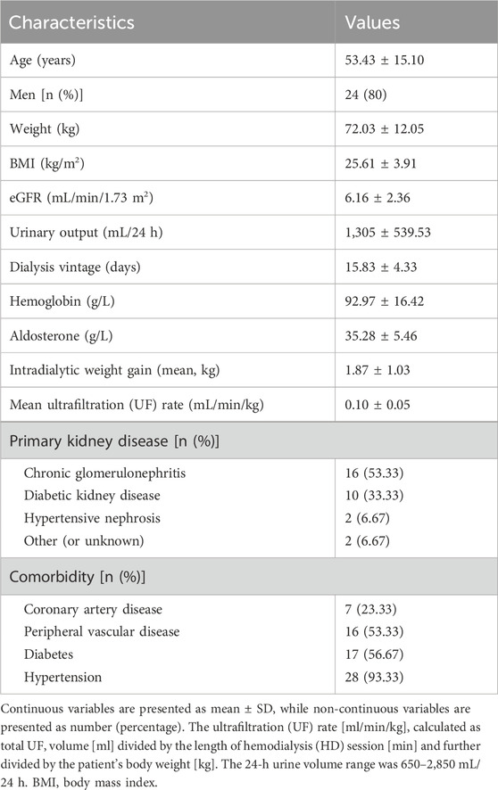 A total of 30 incident HD patients were included. The study subjects’ demographic, clinical, and biochemical characteristics are presented in Table 1. The mean age was 53.43 ± 15.10 years, with 80% male participants. The mean dialysis vintage was 15.83 ± 4.33 days, with a range from 9 to 26 days. The prevalence of comorbidities included 56.67% DM, 93.33% hypertension, 23.33% cardiovascular disease, 53.33% peripheral vascular disease. The eGFR was 6.16 ± 2.36 mL/min/1.73 m2, mean urinary output was 1,305 ± 539.53 mL/24 h, and mean UF rate was 0.10 ± 0.05 mL/min/kg.
