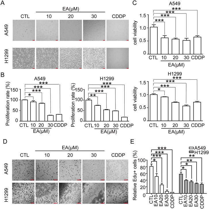 Figure 1. EA suppresses tumor growth in the human non-small cell lung cancer cells. (A) The morphology of A549 and H1299 cells, scale bar = 100 μm. (B) Relative numbers of A549 and H1299 cells. Cell numbers of DMSO-treated group were regarded as 100% n = 5. (C) Viability of A549 and H1299 cells n = 6. (D,E) EdU staining of A549 and H1299 cells after EA and CDDP treatment for 24 h and quantitation of the percentage of EdU-positive cells. Scar bar = 100 μm n = 5. *p < 0.05, **p < 0.01, and ***p < 0.001 compared with the Control group.