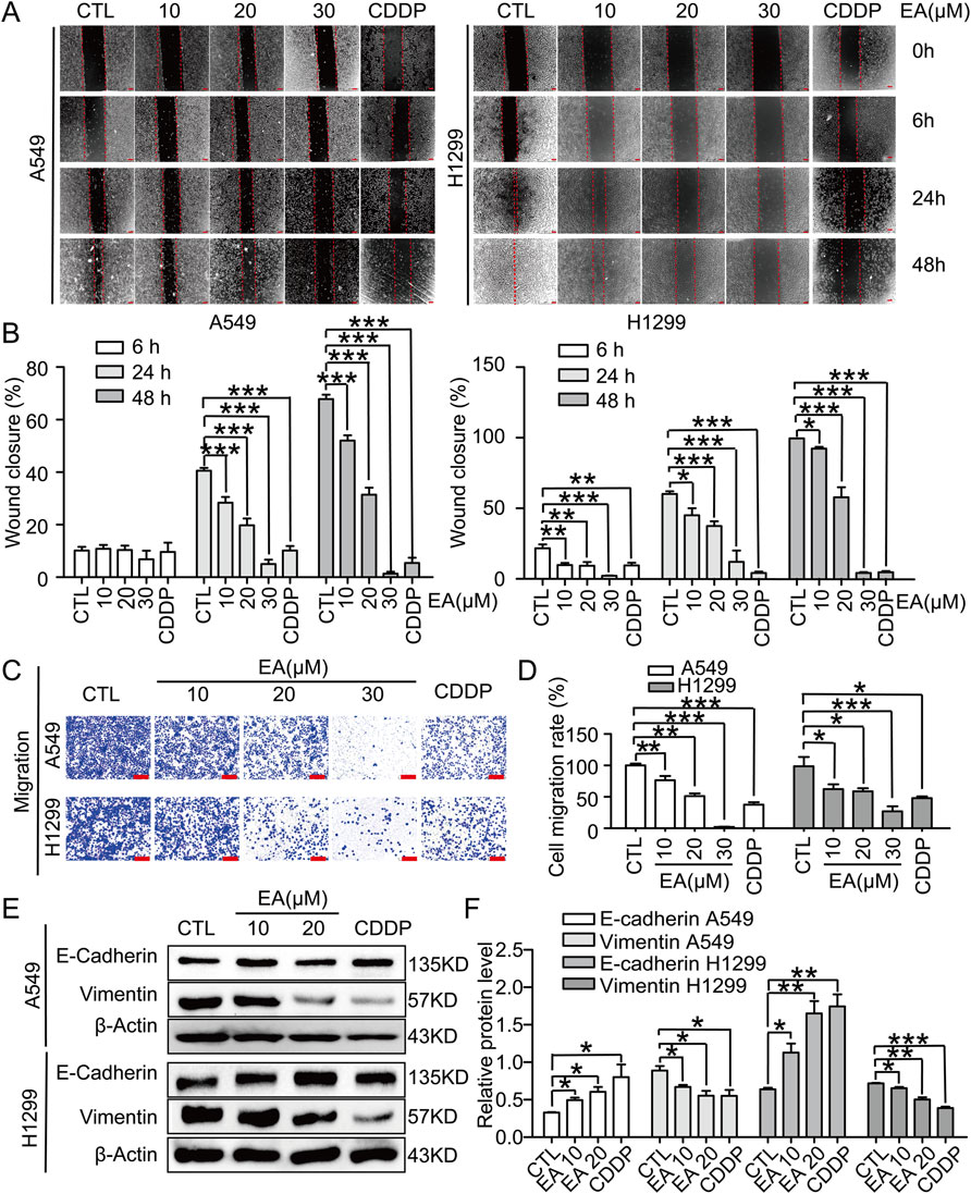 Figure 2. EA inhibits cell migration in human non-small cell lung cancer cells. (A) The migration by wound-healing assay of A549 and H1299 cells after treating with DMSO, 10, 20, 30 μM EA and CDDP for the indicated time, Scale bar = 100 μm. (B) The effect of EA on the wound closure in A549 and H1299 cells n = 5. (C) Transwell migration assays of A549 and H1299 cells treated with DMSO, 10, 20, 30 μM EA and CDDP for 24 h n = 5. (D) The statistical analysis has been presented in histograms, and the migration rates were normalised by the proliferation rate. (E,F) Western blot analysis of the E-Cadherin and Vimentin protein levels at 24 h in A549 and H1299 cells respectively n = 3. *p < 0.05, **p < 0.01, and ***p < 0.001 compared with the Con group.