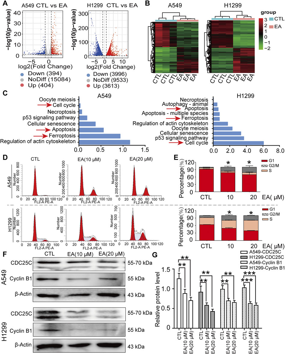 Figure 3. EA induces cell cycle arrest at G2/M phase in human non-small cell lung cancer cells. (A) Volcano plot of differentially expressed genes after EA treatment. (B) Cluster analysis of differentially expressed genes after EA treatment. (C) KEEG analysis of genes in A549 and H1299 cells. (D) Cell cycle of A549 and H1299 cells analyzed by flow cytometry. (E) Percentage of A549 and H1299 cells in different phases n = 3. (F) Representative Western blots of cell cycle-related proteins, CDC25C and Cyclin B1. (G) Densitometry of Western blots in panel n = 6. *p < 0.05, **p < 0.01, and ***p < 0.001 compared with the Control group.