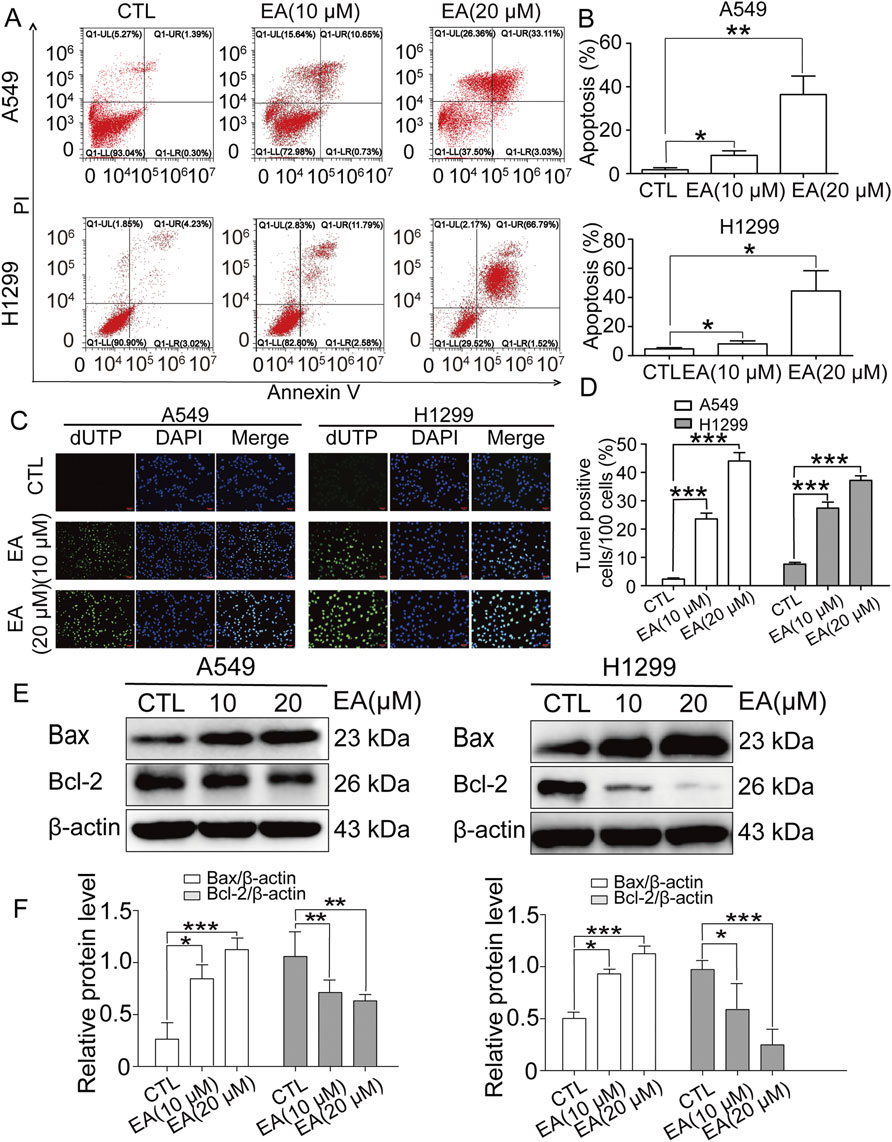 Figure 4. EA induces cell apoptosis in human non-small cell lung cancer cells. (A) Apoptosis analyzed by Annexin V/PI staining. (B) Apoptotic rates of A549 and H1299 cells n = 6. (C) The apoptosis-positive cells of A549 and H1299 cells after EA treatment for 24 h by TUNEL staining (×100). (D) Quantification of TUNEL-positive cells in (C) n = 5. (E) Representative Western blots of cell apoptosis proteins, Bax and Bcl-2. (F) Densitometry of Western blots in panel. *p < 0.05, **p < 0.01, and ***p < 0.001 compared with the Control group.