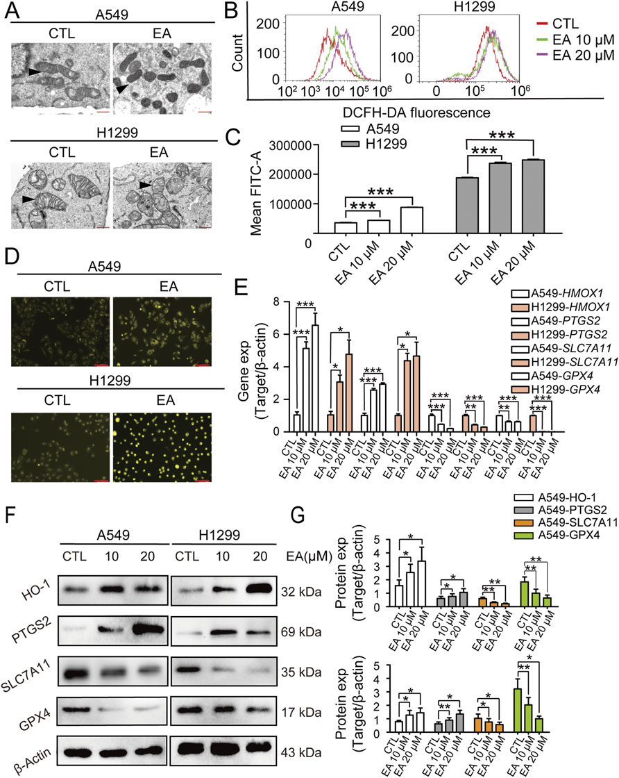 Panel A shows electron microscopy images of A549 and H1299 cells, both with control (CTL) and EA treatment, depicting mitochondrial changes. Panel B displays flow cytometry histograms for DCFH-DA fluorescence, indicating oxidative stress levels. Panel C is a bar graph showing mean FITC-A values for oxidative stress in A549 and H1299 cells. Panel D exhibits fluorescence images of A549 and H1299 cells under control and EA conditions. Panel E presents a bar graph of gene expression levels normalized to β-actin. Panel F illustrates Western blot results showing protein expression levels for various targets. Panel G includes bar graphs summarizing protein expression levels.