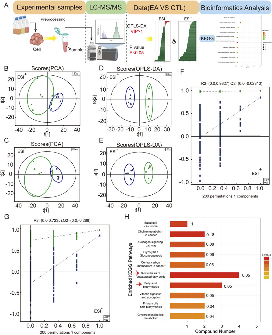 Cells were seeded into a 6-well plate and treated with DMSO or EA (20 μM) for 24 h. Next, the culture medium was removed, and the cells were washed twice with an appropriate amount of pre-cooled PBS. Cells were collected and stored in liquid nitrogen or at −80 °C refrigerator and subsequently delivered to Shanghai Bioroot Biological Technology Co., Ltd., for metabolic analysis. Metabolite extraction and LC-MS/MS detection were performed, along with ProteoWizard and R Programming Language based on Various forms (X) of chromatography mass spectrometry (XCMS), for peak detection, extraction, alignment, and integration. Ten samples were collected from each group. Figure 6A shows the metabolomics experimental method flow chart. Cells were collected from cell culture flasks according to the requirements of metabolomics for collecting samples. LC-MS/MS Orbitrap mass spectrometer or tandem Orbitrap mass spectrometer was used to detect metabolites in samples by retention with metabolites in the local database. Metabolomics usually used strict OPLS-DA VIP >1 and P < 0.05 as the screening criteria for significant differential metabolites.