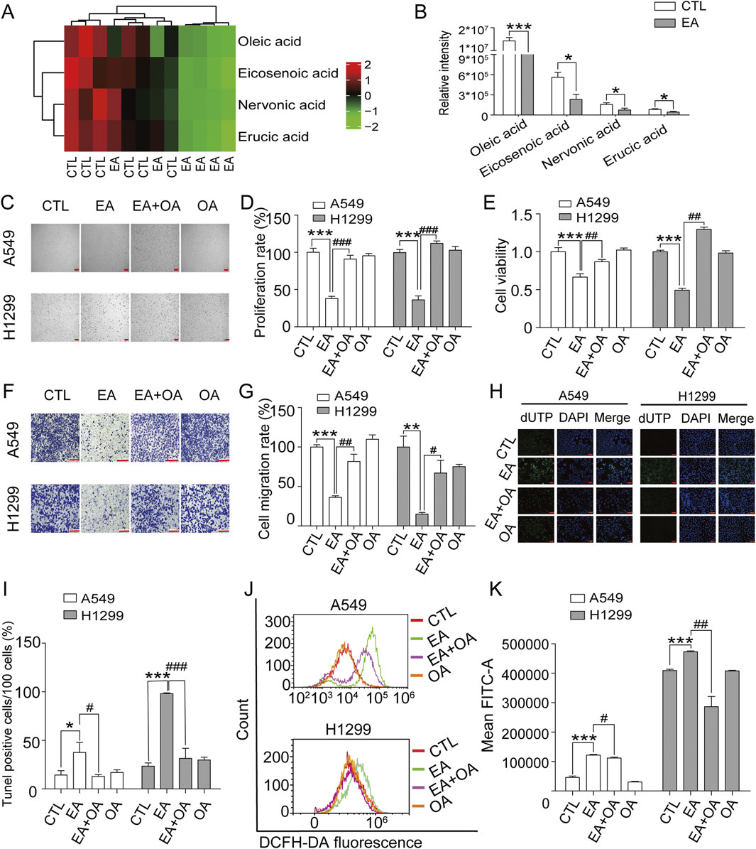 Figure 7. Oleic acid (OA) reverses the inhibitory effects of EA on cell proliferation and migration in human non-small cell lung cancer cells. (A) Enrichment of different metabolites in the biosynthesis of unsaturated fatty acids. (B) Quantitative analysis of four unsaturated fatty acids by metabolomics. (C,D) The effects of EA and OA on cell proliferation of A549 and H1299 cells n = 5. (E) The changes of cell viability in A549 and H1299 cells after EA and OA treatment detected by CCK8 n = 6. (F,G) The effect of EA or OA on cell migration of A549 and H1299 cells by transwell assay n = 4. (H,I) The cell apoptosis after EA or OA treatment detected by Tunel assay in A549 and H1299 cells n = 5. Scale bar = 100 μm (J,K) The production of ROS after EA or OA treatment detected by flow cytometry detection in A549 and H1299 cells n = 4. *p < 0.05, **p < 0.01, and ***p < 0.001 compared with the Control group.