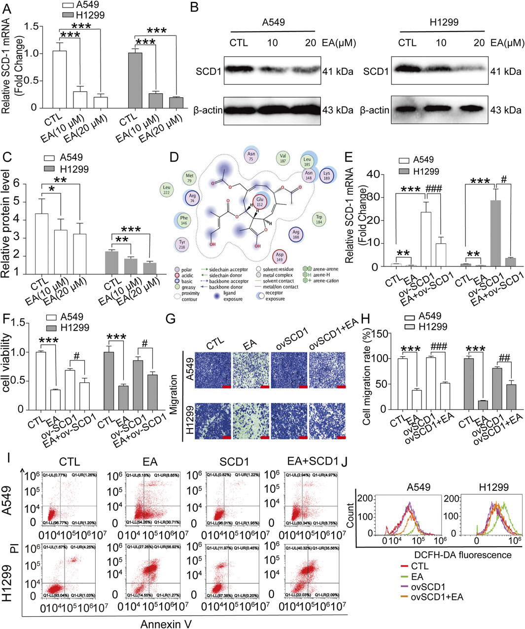 Figure 8. EA induces cell proliferation and migration inhibition of non-small cell lung cancer cells by regulating the expression of SCD1. (A) The SCD-1 mRNA expression detected by qRT-PCR in A549 and H1299 cells n = 6. (B,C) Western blot assay of SCD1 protein expression in A549 and H1299 cells treated with different concentrations of EA n = 3. (D) Molecular docking of agrimonolide (PubChem CID: 77985550) in the SCD1 protein (protein number: 4zyo) was performing using a computational MOE program. (E) The changes of mRNA expression in A549 and H1299 cells after EA administration or overexpression of SCD1 by qRT-PCR n = 5. (F) The viability of A549 and H1299 cells after EA administration or overexpression of SCD1 by CCK8 assay n = 6. (G,H) The effect of EA treatment or SCD1 overexpression on the migration ability of A549 and H1299 cells by Transwell assay n = 4. Scale bar = 100 μm (I) The changes of apoptosis levels in A549 and H1299 cells treated with EA drug or overexpressing SCD1 by flow cytometry. (J) ROS levels in A549 and H1299 cells treated with EA or SCD1 overexpression detected by flow cytometry. *p < 0.05, **p < 0.01, and ***p < 0.001 compared with the Control group.