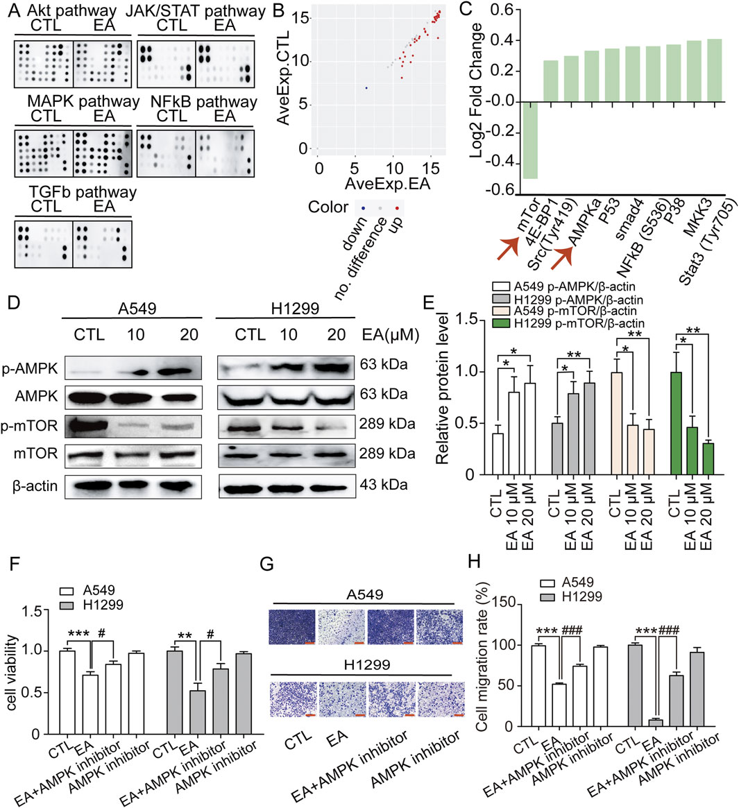 Figure 9. EA activates AMPK-mTOR signal to regulate cell proliferation and migration inhibition of non-small cell lung cancer cells. (A) Membranes showing the spots quantified to study the phosphorylation level of 55 proteins in the phosphoprotein array (5 oncogenic pathways; 55 phosphorylated proteins) in response to 24 h treatment EA. (B) The scatter plot of differential expression proteins (DEPs). Red presents upregulation, blue presents downregulation, and grey presents no difference. (C) Log2 Fold Change of phosphorylation protein level in comparison with the control (DMSO). (D,E) Western blot assay of phosphorylation protein expression of AMPK and mTOR in A549 and H1299 cells treated with different concentrations of EA n = 5. (F) The viability of A549 and H1299 cells after EA administration or AMPK inhibitor by CCK8 assay n = 6. (G,H) The effect of EA treatment or AMPK inhibitor on the migration ability of A549 and H1299 cells by Transwell assay n = 5. Scale bar = 100 μm *p < 0.05, **p < 0.01, and ***p < 0.001 compared with the Control group.